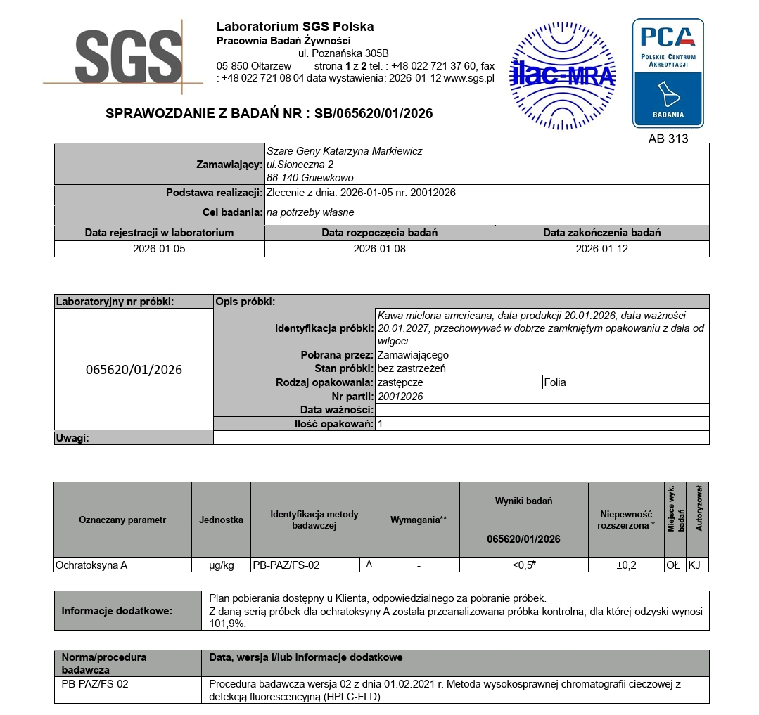 Certyfikat badania na ochratoksyny